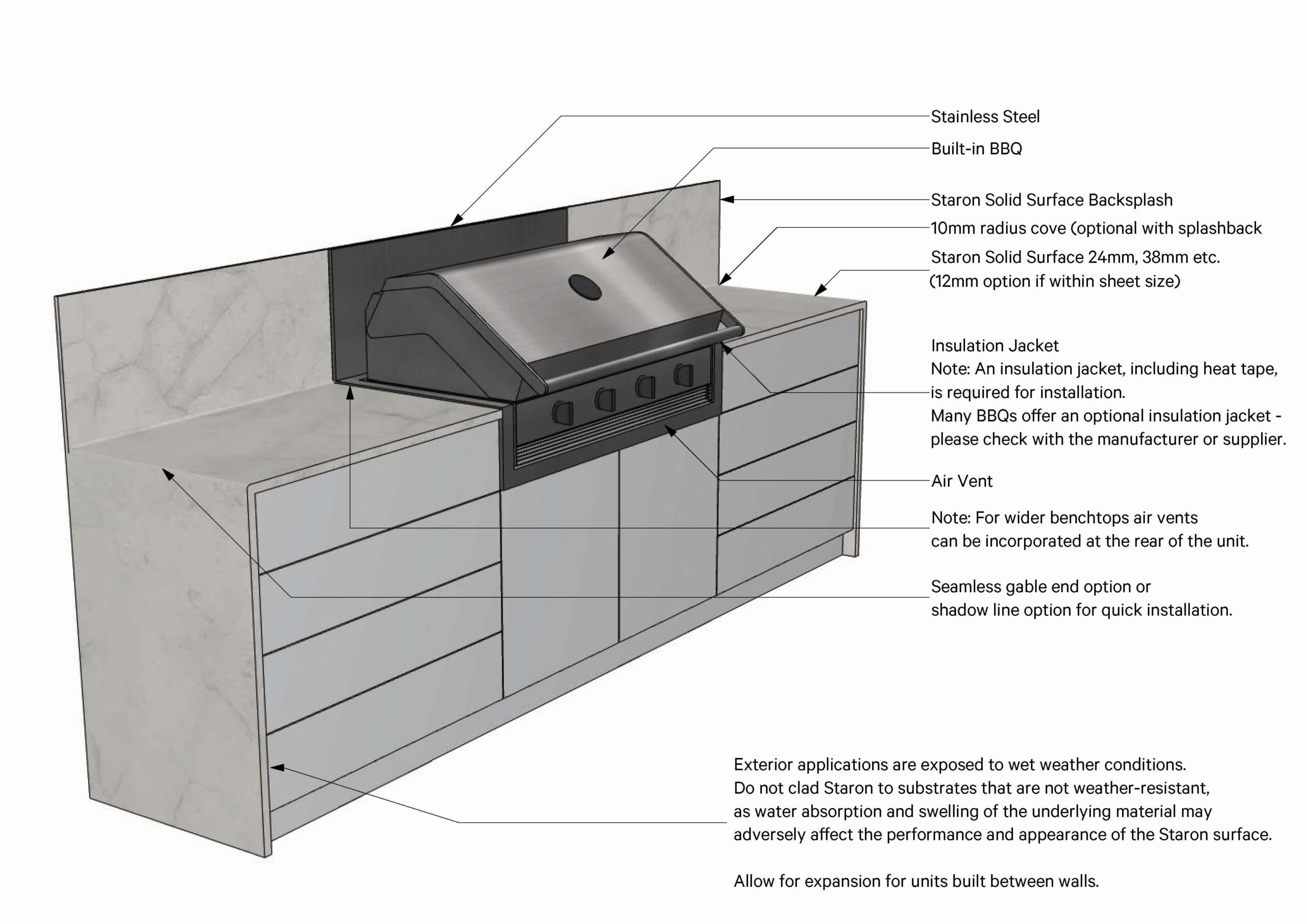 Due to the availability of countless styles of Barbeques on the market and the various design possibilities for cabinet design, there can be many unknowns across these types of applications. For Staron Solid Surface to be covered by Austaron Surfaces warranty, the following recommendations are required.