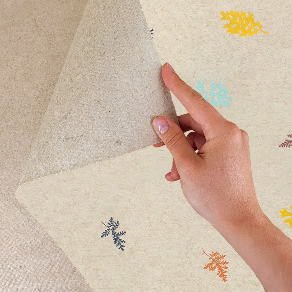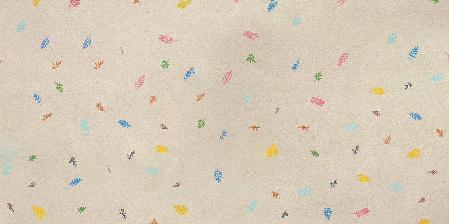 Brightly dyed leaves swirl across the wall like confetti, creating a playful and vibrant atmosphere.