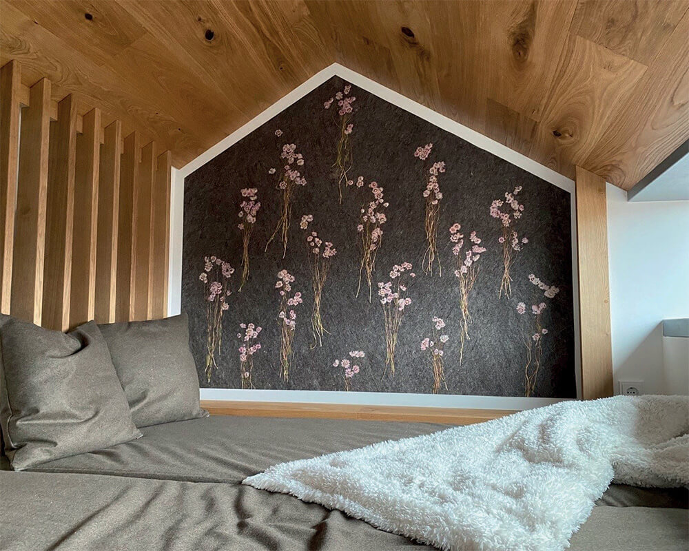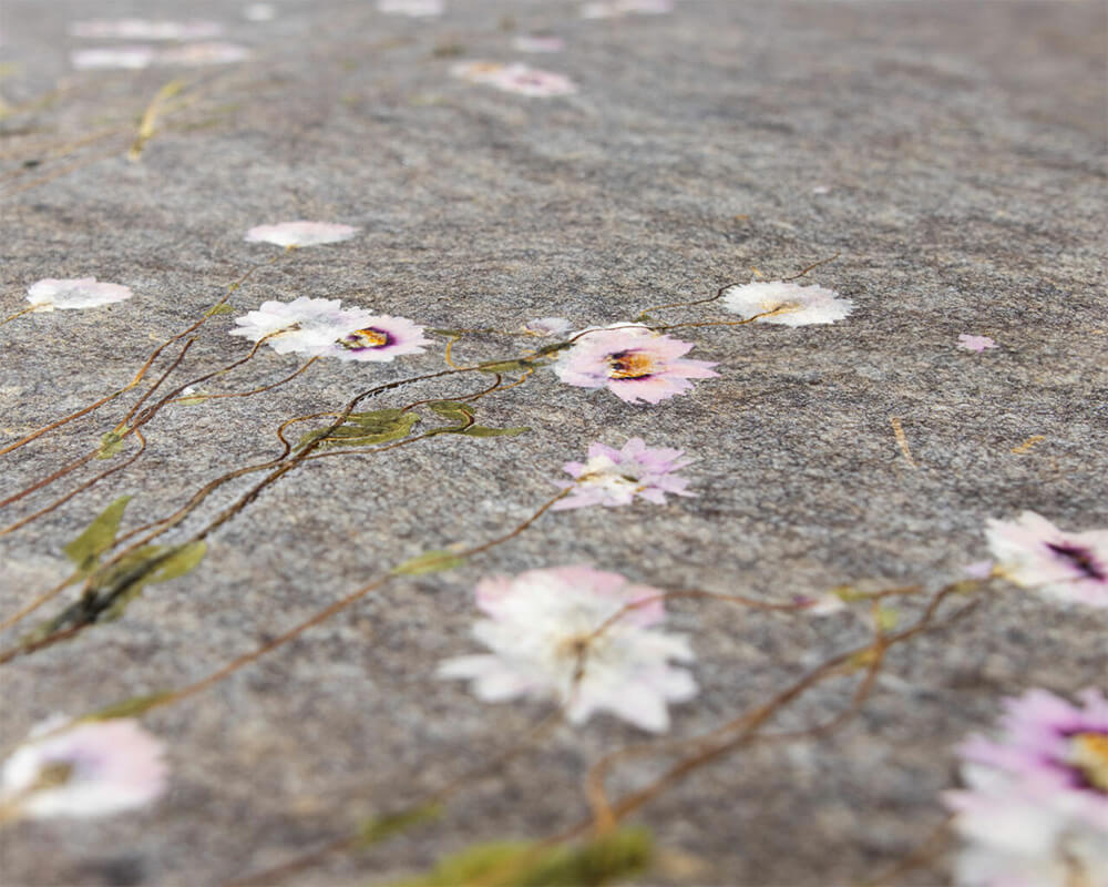 Gentle comfort meets with delicate floral beauty! This natural surface combines both the cosy warmth of sheep’s wool and the intricate elegance of Rhodanthe blossoms.