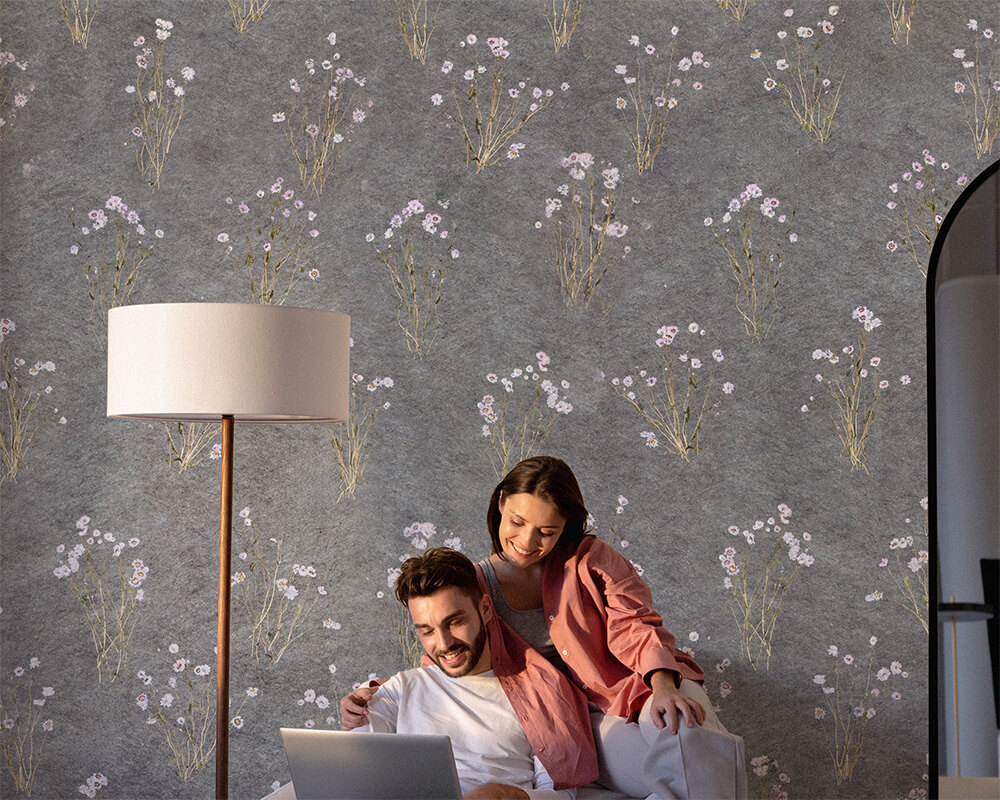 The blend of soft grey and fine flowers creates a harmonious, calming atmosphere, like a snug woollen blanket on a crisp morning in the mountains. Perfect for anyone looking to bring in natural charm, elegance, and a touch of romance.