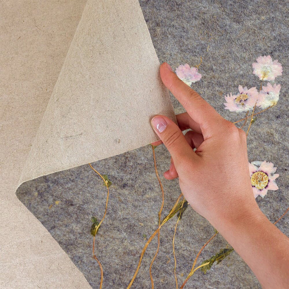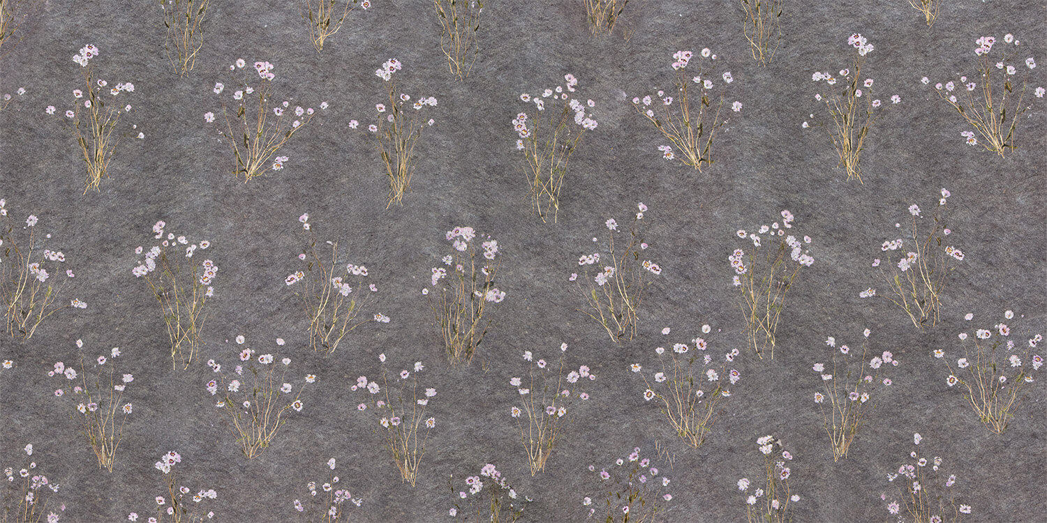 Gentle comfort meets with delicate floral beauty! This natural surface combines both the cosy warmth of sheep’s wool and the intricate elegance of Rhodanthe blossoms.