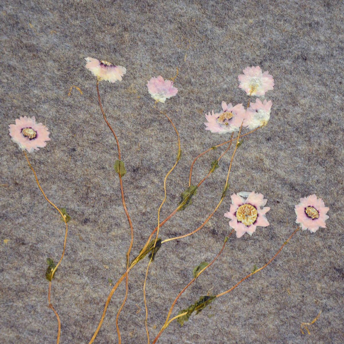 Grey sheep’s wool with delicate pink Rhodanthe flowers on breathable flax fleece.