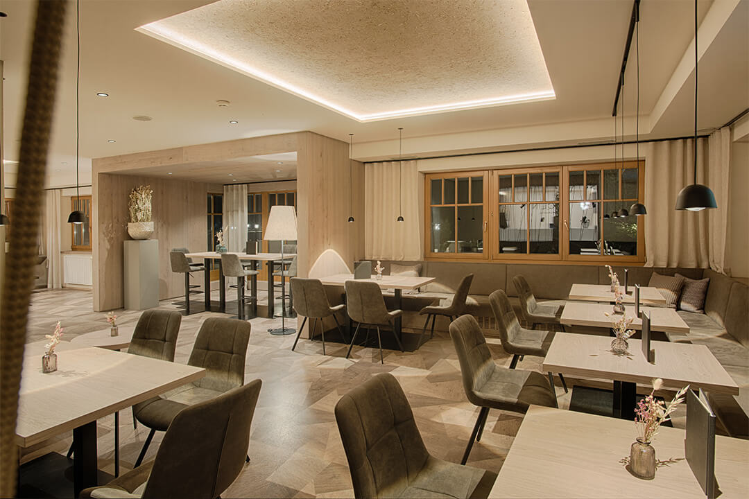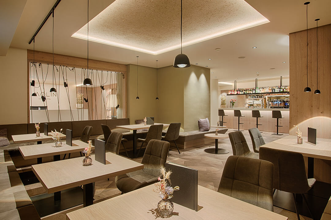 From the reception area to the restaurant and guest rooms, Wildspitze light has been applied to many walls and ceiling applications, infusing these spaces with a comforting natural warmth that beautifully complements other thoughtfully chosen products and surfaces.