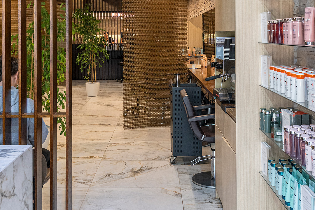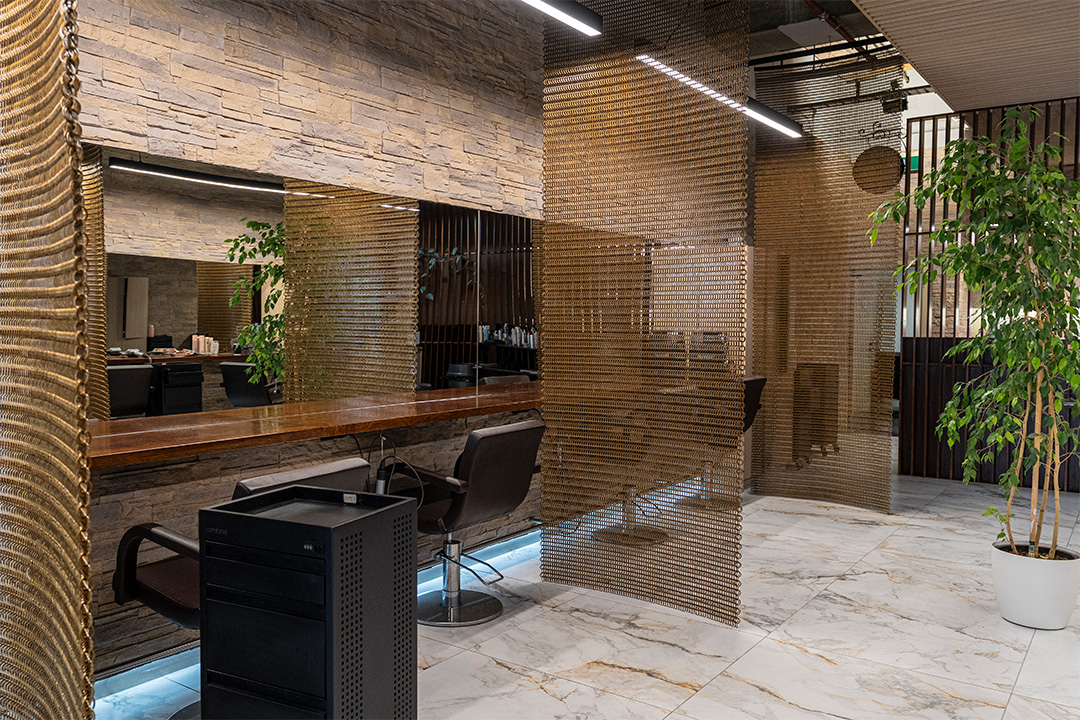 The selected copper colour provides a harmonious complement to the salon’s warm timber and stone finishes, while the mesh’s texture introduces an additional layer of visual interest that enhances the variety of surfaces throughout the fitout.