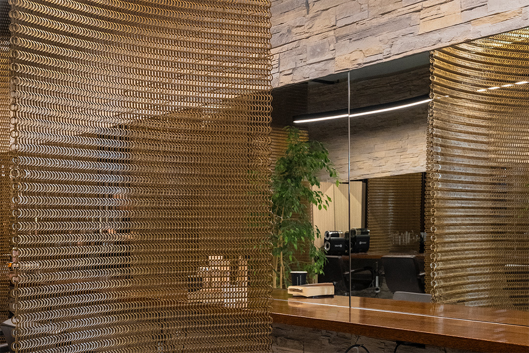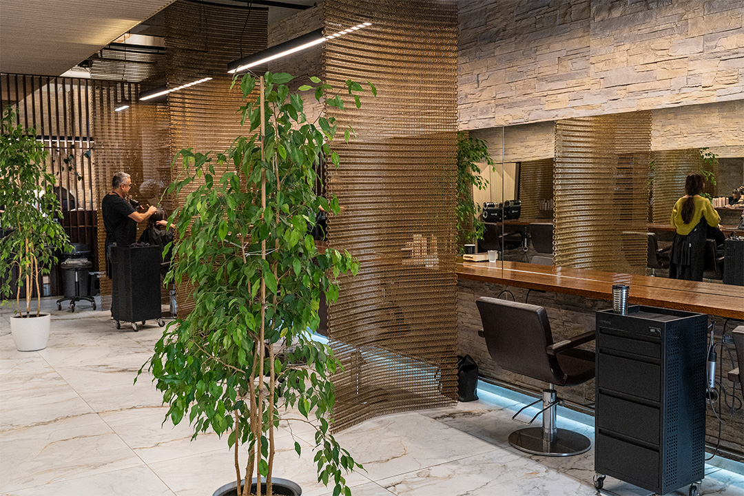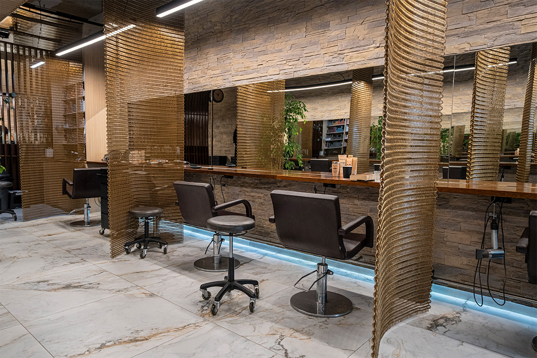 RE/8™ Bio-circular Architectural Mesh by Kaynemaile offers exceptional versatility. Perfect for adding a touch of privacy, it makes an ideal dividing screen within this hair salon. Thanks to its lightweight nature and ease of installation, the mesh is simple to handle, quick to install, and does not require complex supporting systems.
