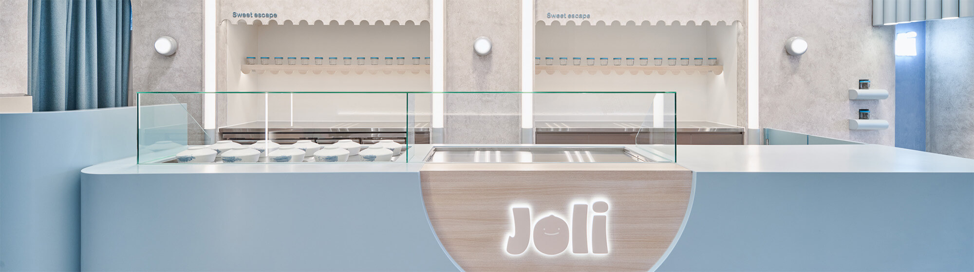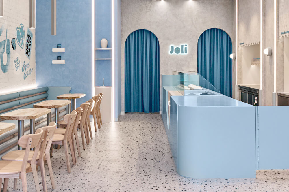 Joli is a culinary delight where design reflects its delectable coconut dessert, transporting taste buds to a tropical paradise. The dominant beach blue colour mirrors tropical beaches, while smooth, fresh ingredients inspire a fluid space, creating a sweet escape experience.