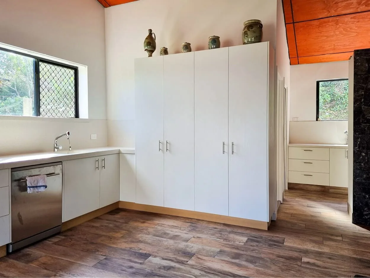 - In 2022, the kitchen was de-fitted, and the Staron benchtop was removed and stored on-site until the new kitchen could be built in 2023.